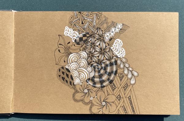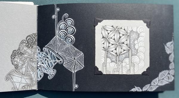 我的禪繞日記也是在用不同的方式講故事,因為它並不是按照時間順序發生的。尤其是我目前正在寫的「Shade Journal混色手札」正式如此,因為我不斷地從一頁跳到另一頁,去探索不同紙和筆呈現出來的陰影效果。這些決定有時是被情緒或者個人偏好所指引,有時是禪繞世界中的一種流行趨勢。所有的回憶和故事散布在日記中的每一頁,禪繞在一起使得這些頁面完整,就像回憶和故事使我們成為我們自己。