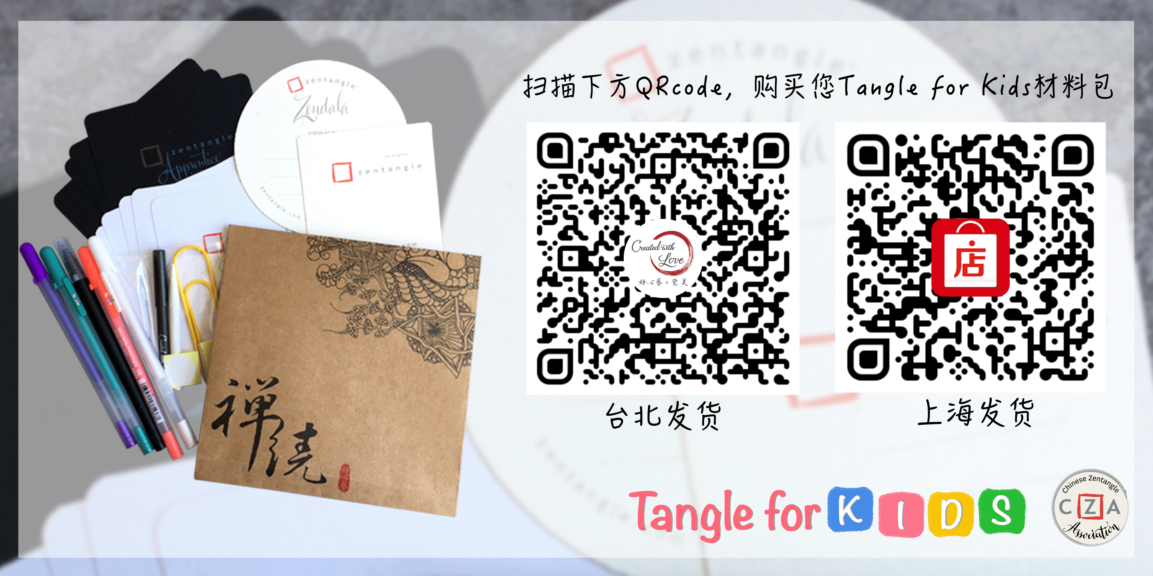 邀請您點擊右側綠字,進入《好心艺网路商店-台北发货》或《Zentangle禅绕官方旗舰店(微店)-上海发货》,參觀選購Tangle for Kids材料包,當然,您也可以運用身邊現有工具一起參與創作。